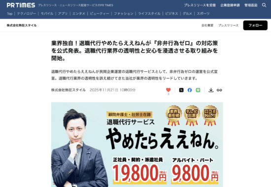 | 事業内容 | 退職代行 / 転職支援 / コンサルティング |