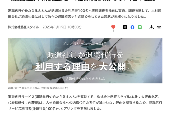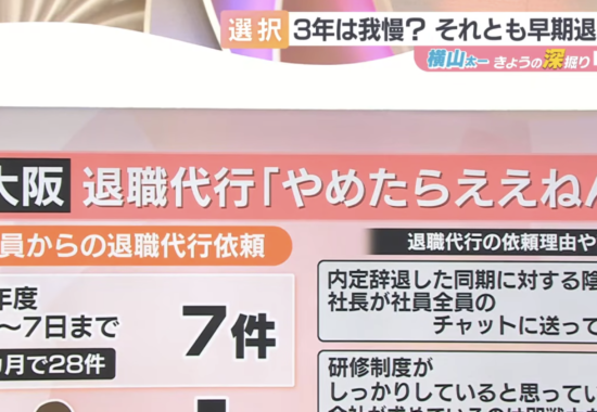 新卒社員の方が入社してすぐに退職代行を利用する理由や背景ついて『退職代行やめたらええねん』の具体的な数字の事例も含めて、取り上げていただきました。是非、ご覧ください!
