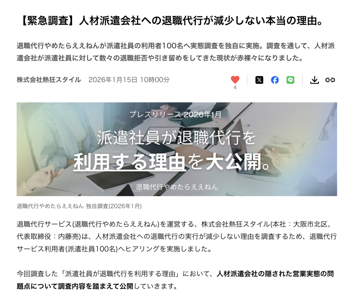 国内最大級のプレスリリース「PRタイムズ」にて、退職代行やめたらえええねんが人材派遣業界の闇を大公開!